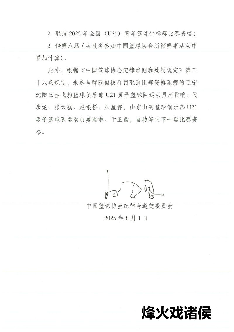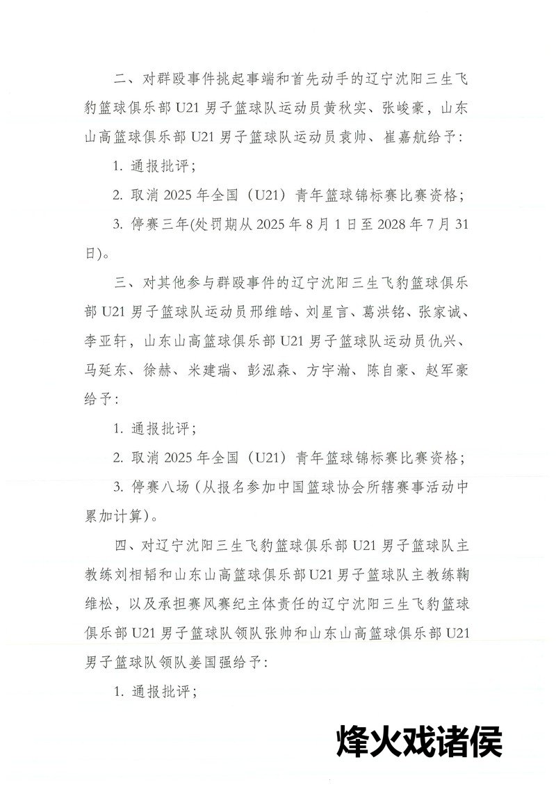 中新网8月1日电 据中国篮球协会官网音尘,8月1日,中国篮球协会顺序与说念德委员会发布对于对辽宁沈阳三生飞豹篮球俱乐部U21男人篮球队和山东山高篮球俱乐部U21男人篮球队群殴事件及涉事东说念主员惩办的见告,全文如下: